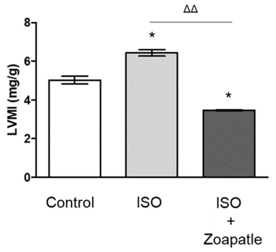 LMIM, left ventricular mass index. Control group; ISO (hypertrophy by isoproterenol group); ISO + Zoapatle (hypertrophy by isoproterenol + Zoapatle group). Lines represent the ventricular mass index in each group; median ± standard error. * p < 0.05 versus without hypertrophy (control group). ΔΔ p < 0.01 versus hypertrophy (ISO group).