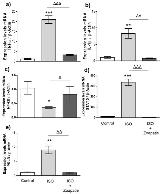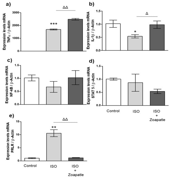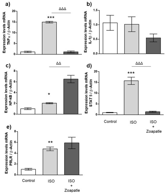 Gene expression in brain. Control group; ISO (hypertrophy by isoproterenol group); ISO + Zoapatle (hypertrophy by isoproterenol + Zoapatle group). (a) TNF-α, tumor necrosis factor alpha; (b) IL-1b, Interleukin 1-beta; (c) NF-kB, nuclear factor kappa B; (d) STAT5, signal transducer and activator; (e) PRLR, prolactin receptor; B; B-Actin. Lines represent median ± standard error. mRNA levels were normalized to B-actin. * p < 0.05, ** p < 0.01, *** p < 0.001 versus control. Δ p < 0.05, ΔΔ p < 0.01 versus hypertrophy (ISO group).