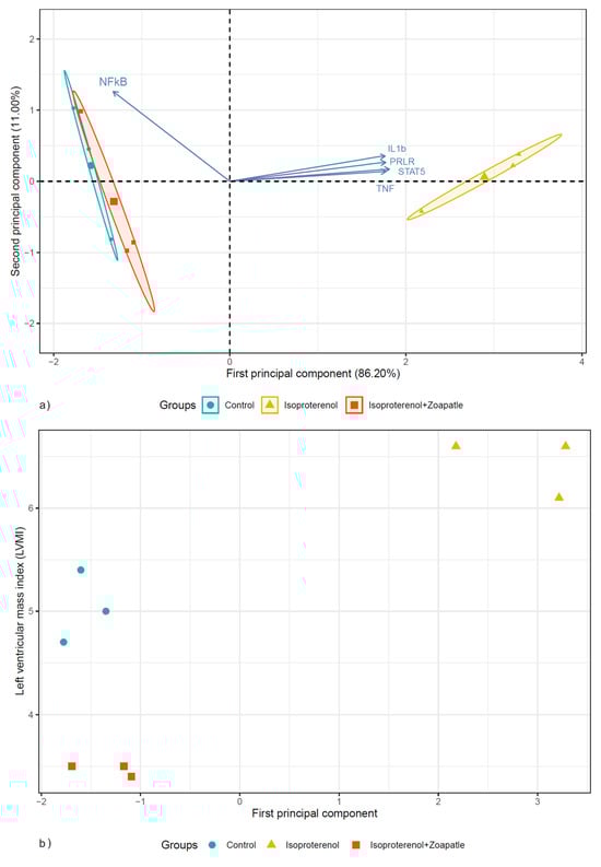 The Kaiser–Meyer–Olkin value is suitable for PCA, 0.7. Subsequently, a PCA was implemented to perform a dimensional reduction of five RNA expression variables. The first two principal components explained 97.2% of the variability. Table 2 shows the variable loading and correlation coefficients for the principal component scores. These components were integrated as follows. First component: STAT5, IL1b, the PRLR, and TNF; second component: NF-κB. Figure 5a shows that the first two principal components formed two clusters; one cluster was formed by the subjects in the ISO group and a second cluster was formed by the control and ISO + Zoapatle groups. The first principal component had a strong correlation with the ventricular mass index (LVMI): 0.79 (95% CI: 0.27–0.95, p = 0.011), as shown in Figure 5b.