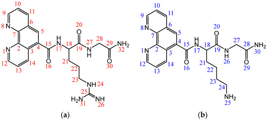 (a) Structure of 5-carboxy-1,10-phenanthroline, arginine, glycine (PhenRG). (b) Structure of 5-carboxy-1,10-phenanthroline, lysine, glycine (PhenKG).