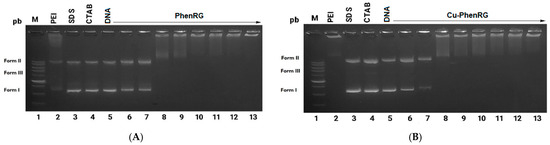 Agarose gel electrophoresis of E. coli pBR322 with the synthesized conjugated peptides and metallopeptides. Lane 1: Molecular weight standard, M (1 kb). Lane 2: DNA/PEI (1:1). Lane 3: DNA/SDS (1:1). Lane 4: DNA/CTAB (1:1). Lane 5: plasmid DNA pBR322 (9 ng/µL). Lanes 6 to 13: DNA with increasing concentrations of the compound (0.125, 0.25, 0.5, 1.0, 1.5, 2.0, 2.5, 3.0 μM). (A) PhenRG; (B) Cu-PhenRG.