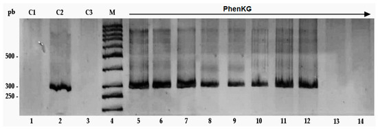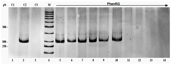Results of 8% polyacrylamide gel electrophoresis. Lane 1: PCR negative control, C1. Lane 2: PCR positive control, C2. Lane 3: peptide negative control, C3. Lane 4: molecular weight marker, M (25 bp). Lanes 5 to 14: increasing concentrations of the PhenRG peptide (0.2, 0.5, 0.7, 1.0, 1.2, 1.5, 1.7, 2.0, 2.5, 3.0 µM).