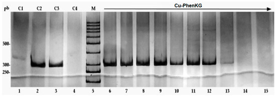 In this context, we evaluated the potential effects of the synthesized compounds in a standard PCR by examining their impacts under varying concentrations of PhenRG and PhenKG, along with their respective Cu complexes. Figure 4, Figure 5, Figure 6 and Figure 7 show the polyacrylamide gel electrophoresis obtained for each of the tests with PCR products corresponding to a 300 bp amplicon. Noticeable PCR inhibition was observed from ~2.5 µM for PhenKG and from ~1.7 µM for Cu-PhenKG (Figure 4 and Figure 5). For PhenRG and Cu-PhenRG, the values were from ~1.7 µM and from ~2.0 µM, respectively (Figure 6 and Figure 7). Again, the presence of the metal implies different effects, these being slightly positive (lower inhibition concentration) for the peptide containing K and slightly negative for that with R as PCR inhibitors. Similar to the electrophoretic mobility shift assay, we observe a two-phase behavior in the PCR inhibition, and see that the conjugated peptides containing R were more effective than their counterparts containing K. This suggests a potential causal link between the observed effects, namely, that the formation of specific DNA complexes above a critical initial concentration of conjugated peptides makes the DNA template nonfunctional by the polymerase. It has long been known that some compounds that interact with DNA can prevent the binding of DNA polymerase [50]. However, we cannot exclude the possibility of compounds also interfering with the function of the oligonucleotides used as primers, or with the polymerase itself.