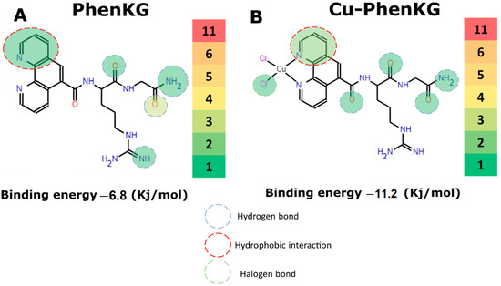 In Figure 8, the hotspots or points of greatest number of interactions of the PhenKG and Cu-PhenKG compounds with DNA can be analyzed. These hotspots correspond to the DNA residues with which the ligands have a greater affinity, and are related to their biological activity. In the case of Cu-PhenKG, it is observed that it establishes a complex interaction with DNA, forming eight hydrogen bonds, one halogen interaction, and two hydrophobic interactions. This diversity in interaction types suggests a multifaceted and robust binding mode, which could be the key behind its high negative binding energy, indicating a strong affinity for DNA.