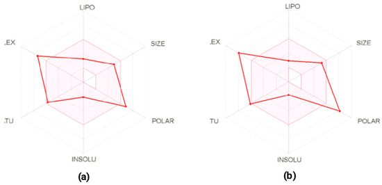 Bioavailability radars. (a) PhenKG and (b) PhenRG. Each axis of the radar represents a distinct property that affects the bioavailability of the molecules. “LIPO” reflects lipophilicity, important for absorption and cellular permeability. “SIZE” denotes molecular size, which is crucial for diffusion through biological barriers. “POLAR” measures polarity, influencing the molecule’s solubility and transport. “INSOLU” indicates insolubility, a critical aspect for drug formulation and oral administration. “TU” is understood as insaturation, which can affect chemical reactivity and molecular interactions. “EX” assesses molecular flexibility, which can impact how the molecule binds to its target and its overall bioactivity.