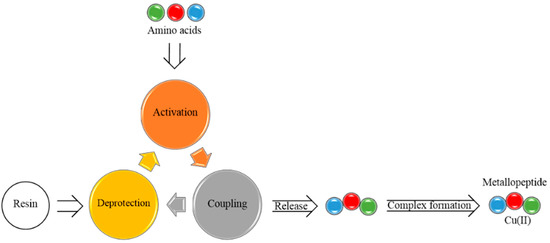 Complexation with the ligand was carried out using copper chloride CuCl2 (97%, Sigma Aldrich, St. Louis, MO, USA) dissolved in water, which was mixed with the peptides synthesized above with a metal–ligand ratio of 2:1 solubilized in a water/methanol (7:3) mixture and allowed to react under constant stirring and at room temperature for five hours [8]. The resulting solution was crystallized by evaporation of the solvent until the complexes were obtained.