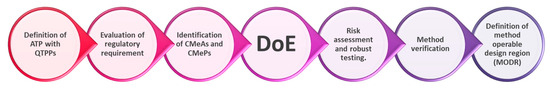 The main target of Quality by Design (QbD) is product design taking into account consistent performance as well as quality [26]. In terms of analytical applications, it pursues an analytical methodology that systematically achieves its intended goal [27]. Basically, its approach comes from conducting a thorough risk assessment and framing its parameters of control. The method is built based on data evaluations and decisions from experimental work [28,29,30,31]. As a first step, the method is defined with purpose suitability as an analytical target profile (ATP) together with a quality target product profile (QTPP) [32,33,34,35,36,37]. Furthermore, upon evaluation, regulatory requirements like pharmacopoeia compliance and ICH Q2 [7] are especially considered. On the ATP, the critical method attributes (CMeAs) are defined with the acceptance criteria, while the critical method parameters (CMePs) are investigated to restrict their influence on method performance and improve the understanding between the CMeAs and CMePs that conjointly strengthen the impact the results. A classic tool of investigation for this is applied mathematics involved in the design of experiments (DoE) [27,29,33,34,38,39].