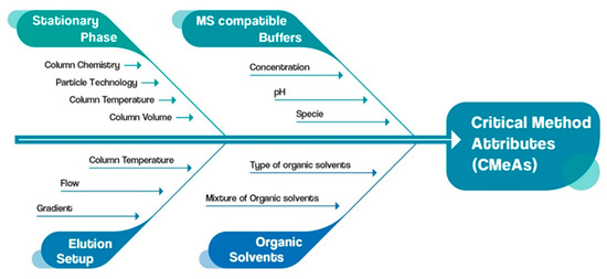 For the identification of the critical method parameters (CMePs), an Ishikawa fishbone diagram was utilized as a quality risk management (QRM) tool (Figure 3). With an effective evaluation of CMePs, their impact on the critical method attributes (CMeAs) is assessed.