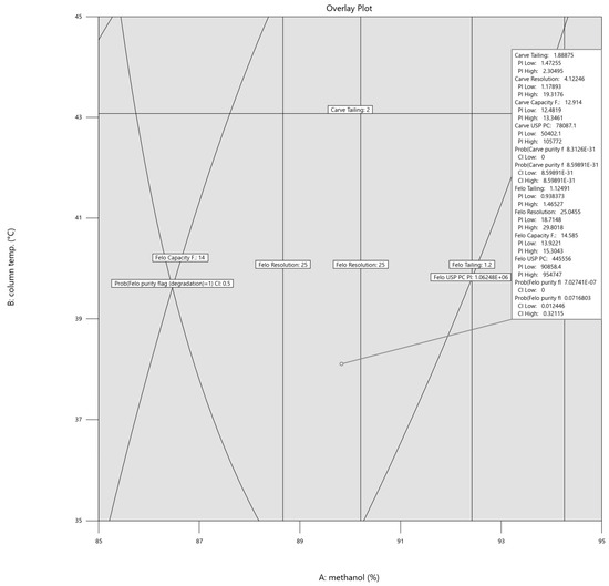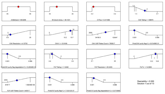 As it turned out, the margin of safety in which the parameters could be varied was broad, as illustrated in Figure 5. Hence, the final setting, using the one-sided confidence interval for the purity flag responses and prediction interval for all the other responses (α = 0.05), was rounded to 90% methanol concentration, 38 °C column temperature, and 0.2 mL/min flow. The rounded values were still well within the intervals (within the border lines), and as depicted in Figure 6 below, the respective intervals for each variable are shown in the flag description.