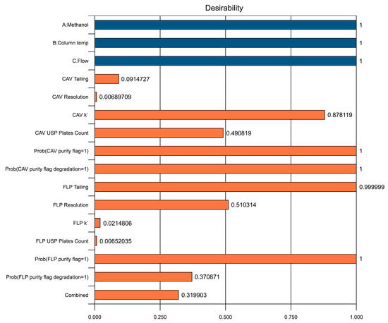The reason for the relatively low desirability value of the resolution for CAV is that the maximum constraint was set based on the maximum real value from the trials, which was 25. However, a predicted resolution of >2 is more than sufficient for a good separation. It is appreciated that even variables at the lower end desirability values had good predicted results, and no issues were found with respect to the defined constraints.