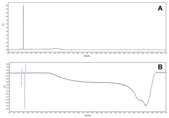 Chromatogram at (A) 240 nm and (B) 362 nm of mobile phase (black) and diluent (blue).
