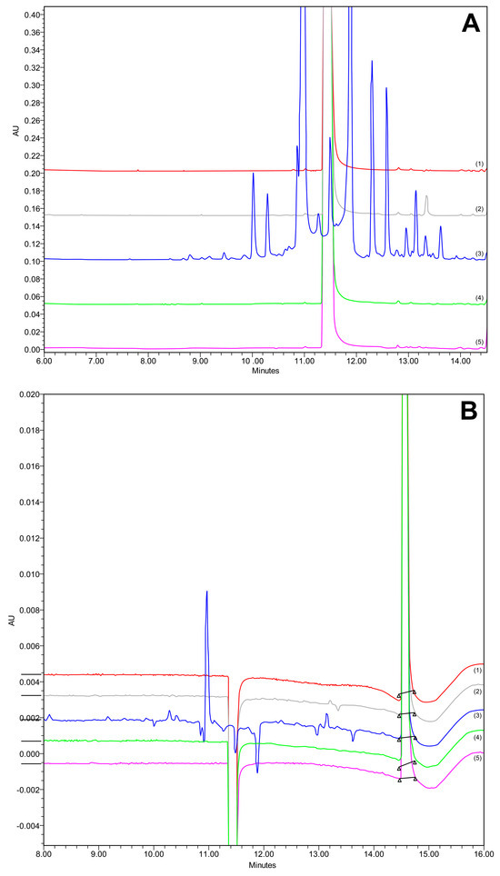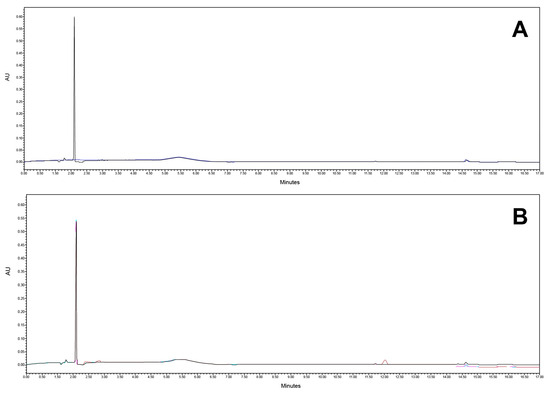 The forced degradation study was conducted in triplicate, and all the peaks were eluted appropriately (Figure 10), with satisfactory peak purity (see Figures S1–S10 in Supplementary Materials). The degradation results are presented in Table 7.