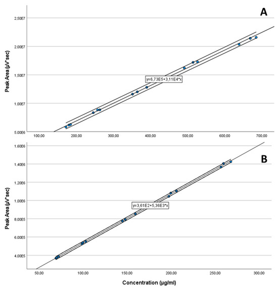 The linearity of an analytical procedure shows that the obtained results are directly proportional to the relevant concentration range of the analyte [7]. Five groups of solutions, in triplicate at concentrations between 70 and 130% of the declared content/labelled claim, were prepared by dilution and dissolving in the diluent [48].