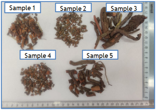Five commercial samples of whole or cut Rubia tinctorum L. roots and rhizomes were purchased in online stores and drugstores in Russia. All of them were sealed and contained instructions for use. They varied in length, had a cylindrical shape and a thickness of 2–18 mm and had reddish-brown bark and orange-red wood (Figure 2).