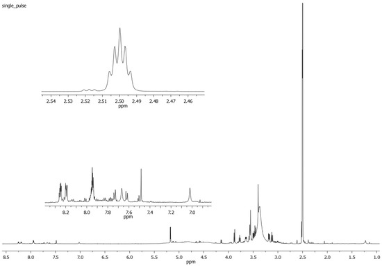 To accurately determine the chemical shifts in 1H NMR spectra, the chemical shift scale must be calibrated. Trimethylsilyl propanoic acid, trimethylsilyl propane sodium sulfonate (TSP) and other organosilicon compounds are commonly used for these purposes. A method for calibrating the scale of chemical shifts in 1H NMR spectra with the signals of residual protons in deuterated solvents has been also described, since the value of a chemical shift is constant for each deuterated solvent [31,32]. The quantitative measurement by 1H NMR spectroscopy is performed by comparing the signal from an analyte with the reference compound signal. This method requires the absence of overlap between the particular signal and the other signals from analyzed substances. If the solvent residual proton signal is used as a reference [21], it is necessary to determine the exact concentration of residual protons in the solvent. In this work, we used the residual proton signal of dimethylsulfoxide-d6 (2.5 ppm) to calibrate the chemical shift scale and quantify the target biologically active substances in the test samples. We determined the exact concentration of residual solvent protons using dimethylsulfone as an internal standard.