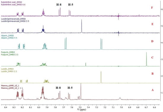 1H NMR spectrum stack in DMSO-d6: (A) extract of roots and rhizomes of Rubia tinctorum L., (B) internal standard of lucidin, (C) internal standard of purpurin, (D) internal standard of alizarin, (E) internal standard of LP, and (F) internal standard of RA.