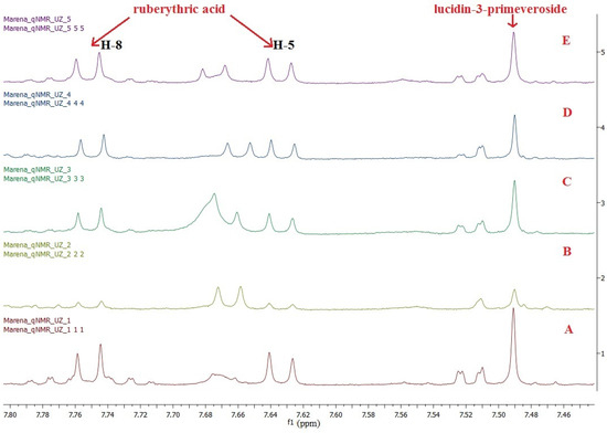 A 1H NMR spectrum stack of the extracts from the roots and rhizomes of Rubia tinctorum L. in DMSO-d6: (A) sample 1; (B) sample 2; (C) sample 3; (D) sample 4; and (E) sample 5.