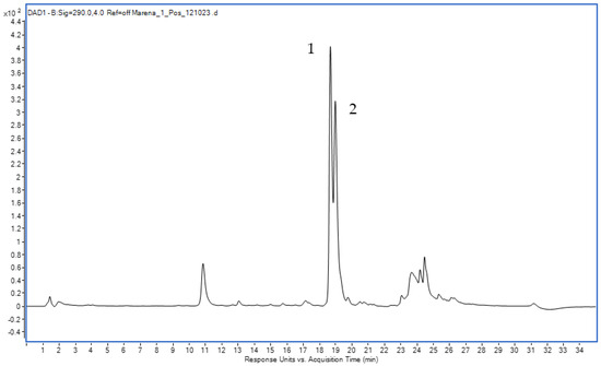 The DAD chromatogram of the extract from Rubia tinctorum L. of roots and rhizomes ((1)—LP, (2)—RA).