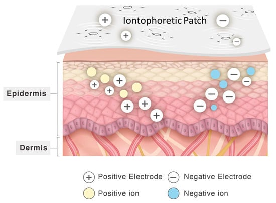 Iontophoresis refers to the application of a physiologically acceptable electrical current to drive drug molecules across the epidermis of the skin [2,3,4]. The main mechanisms of iontophoresis to enhance transdermal drug delivery are electrorepulsion and electro-osmosis. Electrorepulsion transports charged molecules into the skin by the repulsive force of the same charge between the charged molecule and the electrodes. Electro-osmosis is the net flow of water from the anode to the cathode under the influence of an electric current, resulting in the penetration of active ingredients, such as drugs and cosmetics, into the skin [14].