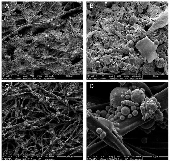 Scanning electron microscope (SEM) images of patches printed with Zn/Ag electrodes (A,B) and Zn/C electrodes (C,D) with the underlying silk fibers. Magnification: (A,C) 300×; (B,D) 3000×. The scale bars are 300 and 30 μm at magnifications of 300× and 3000×, respectively.