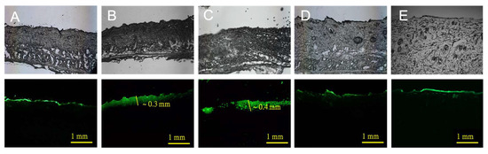 The Zn/Ag-electrode-printed patches were effective in increasing the transdermal depth of fluorescein, as shown in Figure 4. After 5 min of iontophoretic delivery using the Zn/Ag-electrode-printed patches (Figure 4B), NaFI penetrated to a depth of approximately 0.3 mm into the skin. After 20 min of delivery, the depth of NaFI penetration increased to around 0.4 mm (Figure 4C). In contrast, the control experiment using blank patches and the Zn/C-electrode-printed group showed limited fluorescent permeation, which was concentrated in the stratum corneum layer (Figure 4A,D,E). These findings indicate that the use of biocompatible Zn/Ag-electrode-printed patches is an effective method for enhancing the transdermal delivery of drugs and other small molecules. The development of biocompatible, self-generating microcurrent devices has great potential for improving the delivery of drugs and other small molecules for a range of biomedical applications, including the treatment of skin conditions and wound healing [18]. The ability to self-generate microcurrents in the presence of biological fluids increases the versatility and usefulness of the patches in a range of clinical settings. In addition, eliminating the need for an external power supply reduces the complexity and cost of the device, making it more accessible to patients.