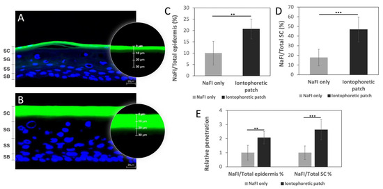 The EpiDerm™ confocal imaging and permeation study analyzed the effects of NaFI solution topically applied with and without an iontophoretic patch. Image of NaFI solution (green) topically applied in control group (A) and experimental group (B). Comparison of the permeation depth of NaFI solution in relation to the total epidermal thickness (C) and the SC thickness (D) in the control and experimental groups. Relative penetration was also assessed in comparison to the epidermis or SC (E). Data represent mean ± SD (ncontrol = 6; nexperimental = 9); the results showed a significant difference in iontophoretic group against NaFI-only group in the epidermis (** p < 0.005) and SC (*** p < 0.001). Counterstaining of cell nuclei with DAPI (blue). Scale bar: 20 µm. Stratum corneum (SC); stratum granulosum (SG); stratum spinosum (SS); stratum basale (SB).