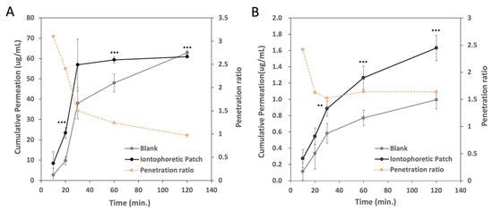 In vitro penetration of (A) SAP (sodium ascorbyl phosphate) and (B) acetyl hexapeptide-8 through artificial film Strat-M® membrane by unprinted patch (blank) or microcurrent-electrode-printed patch for 2 h. Experiments were performed in triplicate and data represent mean ± SD (n = 3). The results showed a significant difference between blank and iontophoretic group (** p < 0.005, *** p < 0.001).