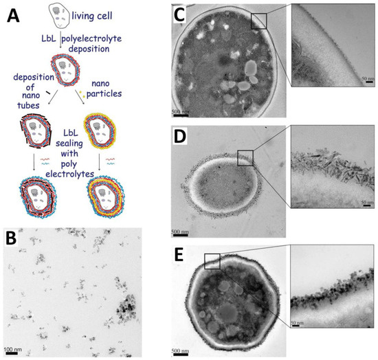 Scheme of polyelectrolytes-modified Layer-by-Layer deposition of iron nanoparticles onto the cell surface (A) (reproduced with permission from [49]; typical TEM image of polyelectrolyte-stabilized magnetic nanoparticles (B); reproduced with permission from [50]; transmission electron microscopy images of thin sections of (C) native yeast cells; (D) yeast cells coated with polyelectrolytes-stabilized magnetic nanorods and LbL coated with polyelectrolytes layers; and (E) yeast cells coated with series of polyelectrolytes/polyelectrolyte-stabilized magnetic nanospheres. Reproduced with permission from [51].