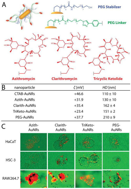 Schematic representation (A,B) physiochemical characteristics of the macrolide-gold nanorods used herein. Cardioid immersion dark-field scattering microscopy (DFSM) of cell cultures (green) illustrating preferential uptake/accumulation of macrolide-gold nanorods (red) into tumor-associated macrophage cells (RAW 264.7) relative to squamous cell carcinoma (HSC-3) and keratinocyte cells (HaCaT) (C). Reproduced with permission from [80].