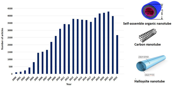 Publication activity related to the fabrication and use of nanotubes. In scheme illustration from [97,98] used under an open access Creative Commons CC BY 4.0 license.