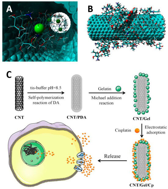Localization of doxorubicin molecules inside CNTs (A) and on the outer surfase of nanotube (B) From [100] under an open access Creative Commons CC BY 4.0 license; (C) illustration of the process for the preparation of CNTs functionalized with cysplatin and its mechanism of action for antitumor effects. From [88] under an open access Creative Commons CC BY 4.0 license.