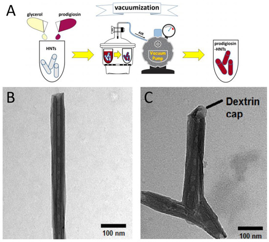Loading of drugs into HNTs lumen. (A)—Scheme of vacuum-facilitated loading of prodigiosin (Adapted from [131]), (B,C)—TEM images of HNTs loaded with paclitaxel without dextrin caps (B) and with dextrin caps (C). Adapted from [132] with permissions from Elsevier Inc.©.