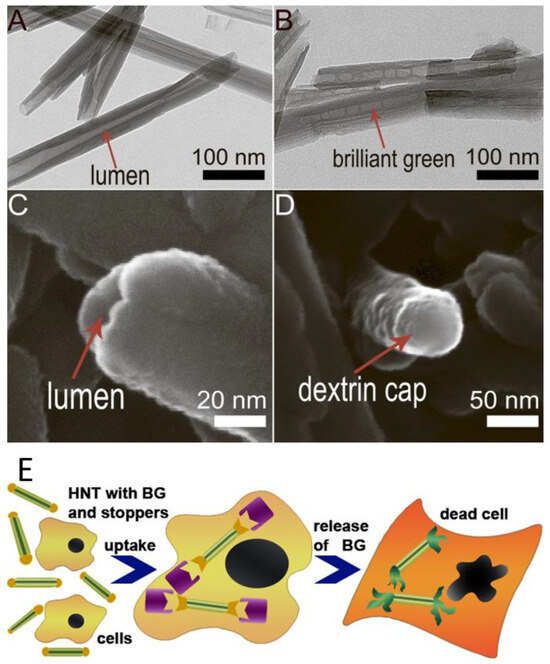 (A)—TEM image of pristine HNTs; (B)—TEM image of brilliant green loaded halloysite; (C)—SEM image of an end of pristine nanotube with open lumen; (D)—SEM image of a dextrin cap on the end of the nanotube; (E)—a scheme of the enzyme-activated anticancer drug delivery system based on drug-loaded HNTs with dextrin stoppers. Reproduced with permission from [163].