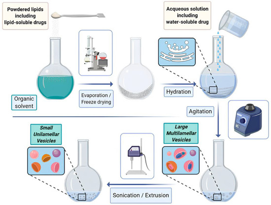 The thin film hydration method (Figure 10) which also called Bangham method, is one of the earliest and most widely used methods for liposome fabrication. In this method, lipid components are dissolved in an organic solvent to form a thin lipid film on the walls of a round-bottom flask. The film is then hydrated with an aqueous solution, leading to the formation of multilamellar vesicles (MLVs). These MLVs can be further processed into small unilamellar vesicles (SUVs) or large unilamellar vesicles (LUVs) through extrusion or sonication [179].