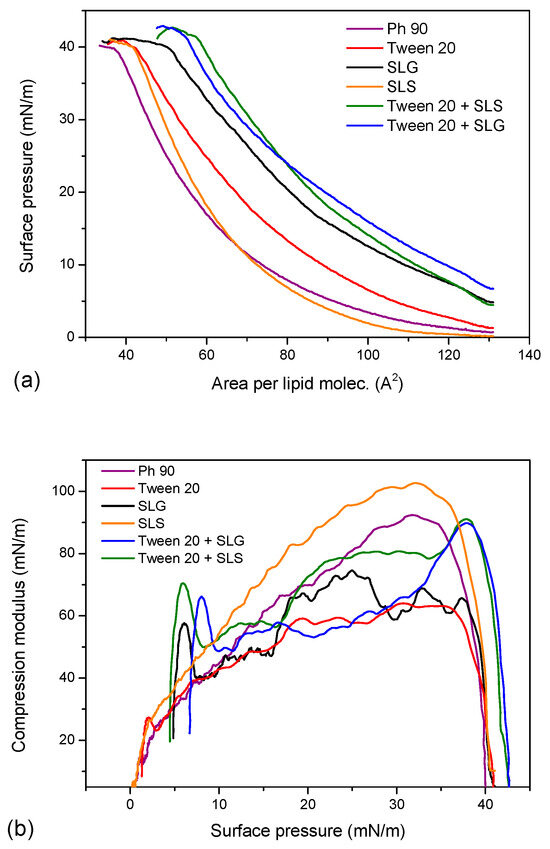 The π-A isotherms for Ph90 in the presence of various surfactants are shown in Figure 1a. Except for SLS, the surfactants caused a significant shift in the curves towards higher-molecular-weight areas, indicating their insertion into the lipid monolayer. Similar results were reported for lipid monolayers in the presence of other soluble surfactants such as 1-alkyl-1-methylpiperidinium bromides [39]. Other authors suggested that cationic and anionic surfactants may affect lipid monolayers by different mechanisms governed by electrostatic forces [40]. The effect of soluble surfactants on phospholipid films is often explained via a kinetic barrier of desorption of the surfactant from the air/water interface, which is different for neutral and charged molecules [41]. Our results demonstrate the potential of surfactants to affect lipid monolayers and act as edge activators in pharmaceutical formulations based on Phospholipon 90. Furthermore, the elevated initial surface pressure at A ≈ 130 Å2/mole confirmed the surface activity of the surfactants and the synergistic effect of Tween 20 + SLG and Tween 20 + SLS, which increased the surface pressure more efficiently than the single surfactants alone did at the same total concentration. This implies that the functionalization of lipid vesicles might be achieved using a smaller total amount of edge activators if Tween 20 is mixed with an anionic surfactant, in comparison to a single surfactant. The monolayer of Ph90 was also slightly more stable in the presence of Tween 20 + SLG and Tween 20 + SLS as the monolayer collapsed at a higher surface pressure than was observed for the other films. This result indicates that the addition of these surfactants may have a slightly positive impact on the stability of transethosomes. The compression modulus curves in Figure 1b reflect the packing and ordering of the films. The plot indicates the fluidizing effects of Tween 20 and SLG on the lipid monolayer, as their maximum values of Cs−1 were lower than that of Ph90. This indicates that the monolayer is more compressible in the presence of these compounds, which might be perceived as beneficial for lipid vesicles that can more easily undergo deformation during transdermal drug delivery. By contrast, SLS increased the compression modulus, suggesting that the monolayer became more compact. The combination of surfactants caused fluidization of the monolayer only for <35 mN/m; however, the maximum Cs−1 value was reached at 39 mN/m, which was close to the value obtained for the Ph90 monolayer. This suggests that vesicles modified with combined surfactants may be more tightly packed, smaller, and less susceptible to drug leakage.