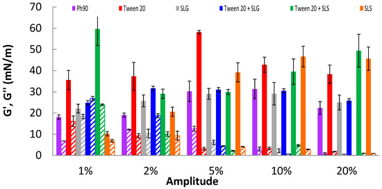 The results of the interfacial dilational rheology studies are shown in Figure 2 as average values with standard deviations. The dominance of elastic properties over viscous behavior was observed when comparing the G″ and G′ values for the same amplitude. Most of the surfactants caused an increase in G′ in comparison to the monolayer of pure Ph90. The largest effect was observed with Tween 20, SLS, and their combination, suggesting their considerable potential to modify the deformability of lipid nanocarriers in formulations and enhance the permeation of the drug through the skin. For SLG and Tween 20 + SLG, the elastic modulus was close to the G′ observed for pure Ph90, regardless of the amplitude applied. The contribution of the viscous component to the interfacial viscoelasticity was most significant for small amplitudes and decreased with increasing amplitude. Considering the capability of transethosomes to significantly decrease their radius when permeating the skin barrier, the results of the dilational rheology experiments were most relevant to drug permeation through the skin for the largest amplitude of deformation. Therefore, by analyzing the values of G′ for an amplitude of 20%, one can observe the positive impact of Tween 20, SLS, and their combination on the elastic response of the lipid layer on area deformation. This means that vesicles modified with these edge activators may be capable of restoring their original size and shape after the force-causing deformation is removed. In other words, these vesicles may be more flexible and stable than the other formulations.