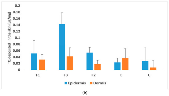 Ex vivo skin permeation experiments on human cadaver skin were performed using Franz diffusion cells to evaluate the potential of these formulations for TQ delivery through the skin. The drug permeation profiles of TQ, the cumulative amount of TQ that permeated through the epidermal and dermal layers over 24 h of the skin permeation study, and the amount of TQ deposited in the epidermal and dermal layers at 24 h after the completion of the skin permeation study are shown in Figure 3.
