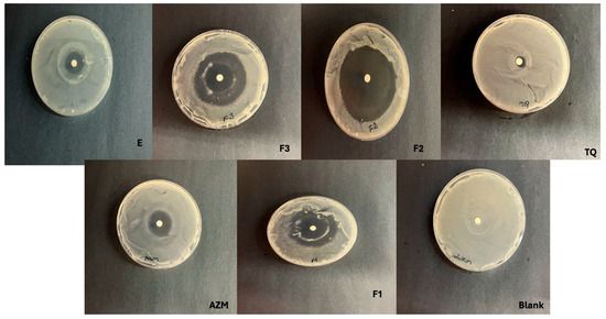 Bacterial inhibition study. Inhibition of S. aureus growth on agar plates by negative control; by azithromycin 15 µg, positive control; and by F1, F2, F3, E, and TQ 40 µg. AZM: azithromycin, TQ: the control formulation of TQ in hydroethanolic solution.