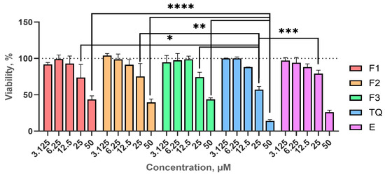 To evaluate the safety of the transethosomal formulations, we performed a series of tests on the HaCaT human keratinocyte cell line. This study included the evaluation of three transethosomal formulations (F1–3), one blank formulation, and a single-component TQ solution. As shown in Figure 5, various concentrations of the formulations were examined, ranging from 3.125 to 50 µM TQ in the formulation or an equivalent amount of transethosomes in the blank formulation. The results indicated that the TQ formulations had a significantly improved safety profile compared to TQ alone. In addition, no discernible changes were observed among the three transethosomal formulations. These results highlight the potential of transethosomal delivery systems in improving the safety of TQ-based formulations for future applications.