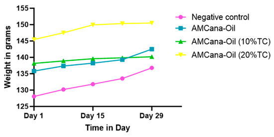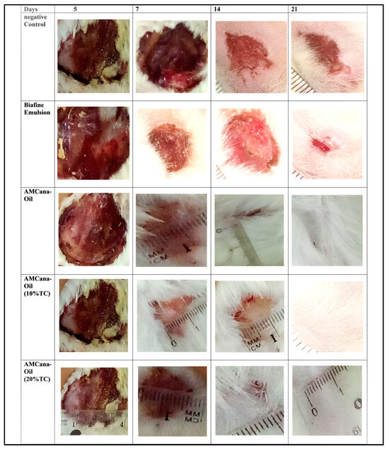For evaluating wound healing activity, we employed an excision wound model following the Morton and Malone protocol (1972) [25]. Animals belonging to five groups (1: AMCana-Oil (0% TC); 2: AMCana-Oil (10% TC); 3: AMCana-Oil (20% TC); 4–5: positive and negative controls) received relevant topical treatments. Anesthesia was induced through intraperitoneal injection of thiopental (60 mg/kg body weight), followed by shaving the dorsal area using an electric clipper. The shaved area was sanitized with 70% surgical alcohol. Subsequently, the marked wound area was excised using a heated plate, and the wound size was immediately measured. Topical treatments were administered once daily until complete healing. The gradual reduction in wound size for each animal was periodically monitored on days 0, 4, 7, 9, 11, and 14. The Percentage Contraction in Wound (PCW) was calculated using the following formula: