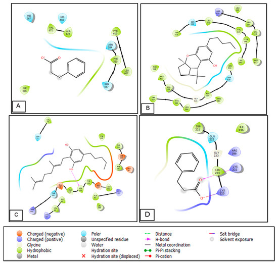 Two-dimensional diagrams of ligands interactions with the active sites. (A) Benzenepropanoic acid interactions with the active site of 5-lipoxygenase. (B) Cannabidiol interactions with the active site of cycloxygenase-2. (C) Cannabigerol interactions with the active site of Glycogen synthase kinase 3. (D) Benzenepropanoic interactions with the active site of Casein Kinase 1.