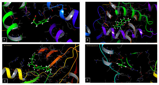 Three-dimensional diagrams of ligands interactions with the active sites. (A) Benzenepropanoic acid interactions with the active site of 5-lipoxygenase. (B) Cannabidiol interactions with the active site of cycloxygenase-2. (C) Cannabigerol interactions with the active site of Glycogen synthase kinase 3. (D) Benzenepropanoic interactions with the active site of Casein Kinase 1.