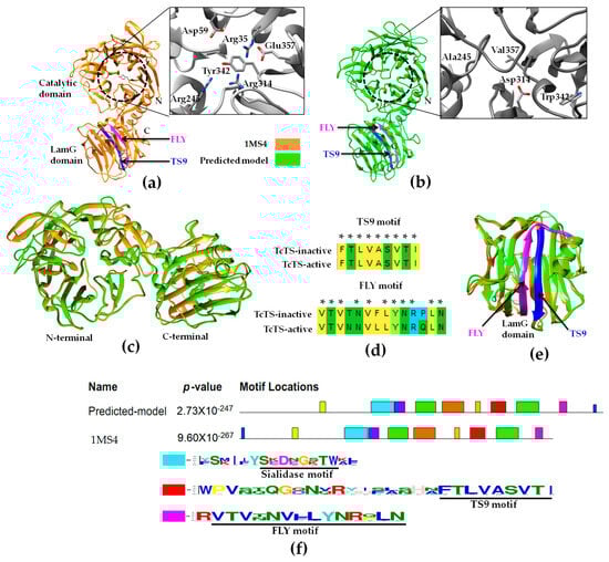 Molecular modeling of 3D structures of two TcTS proteins and identification of conserved motifs in T. cruzi. (a) TcTS-active structure (PDB code: 1MS4). (b) Theoretically predicted TcTS-inactive structure (accession: AAD13347.1). (c) Structural alignment of the C-terminal region of the TcTS-active protein and the theoretically predicted TcTS-inactive. (d,f) Sequence alignment and identification of conserved motifs, sialidase, TS9, and FLY. The colored boxes indicate the identified motifs. (e) Alignment of the complete structures of TcTS-active (PDB code: 1MS4) and the theoretically predicted TcTS-inactive. Asterisks (*) indicate highly conserved residues.