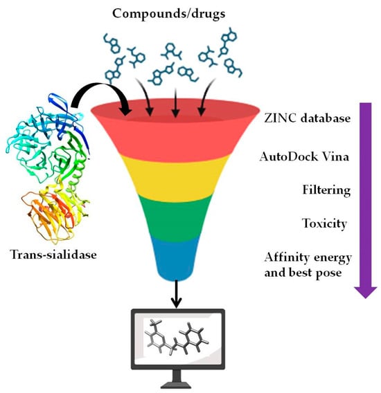 A universe of commercially available and FDA-approved compounds is used for conditions other than those initially intended [23]. In this sense, drug repositioning through molecular docking is of great importance, which consists of making computational predictions of compounds that bind to a protein at specific sites [24]. Molecular docking allows us to make this type of prediction to identify new biological activities of drugs for clinical use [25]. In this work, we execute the molecular docking-based virtual screening method (Figure 2) directed at the TcTS-active and TcTS-inactive proteins of T. cruzi to identify potential anti-Chagas compounds. We use the Drug Discovery TACC server of the Texas University Advanced Computing Center to do this. This server extracts thousands of FDA-approved drugs from the ZINC database, including some natural compounds (https://drugdiscovery.tacc.utexas.edu/; accessed on 3 January 2023).