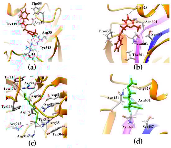 By separately analyzing the five compounds in both TcTS proteins, surprisingly, we found that the compounds N-[(4-methyl-6-oxo-1H-pyrimidin-2-yl)methyl]benzamide (ZINC20031597) and sulforaphane (ZINC3875035) bind in specific regions of both TcTS proteins of T. cruzi. Docking predicted that the compound N-[(4-methyl-6-oxo-1H-pyrimidin-2-yl)methyl]benzamide can bind in both the pocket and the C-terminal region of the TcTS-active protein (Figure 3a,b). In the pocket, this compound interacts through four H-bonds with residues Arg35, Arg314, and Asp59, while in the C-terminal region, it possibly interacts with three H-bonds with residues Pro450, Asn603, and Asn604 of TS9 and FLY peptides (Figure 3a,b).