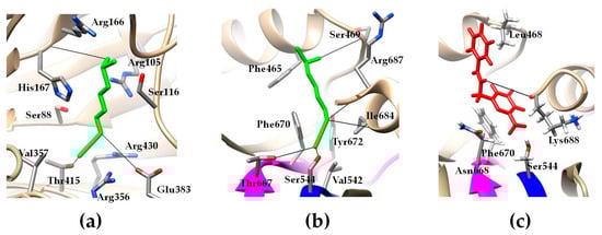 On the other hand, these two molecules (N-[(4-methyl-6-oxo-1H-pyrimidin-2-yl)methyl]benzamide and sulforaphane) bind in the C-terminal region of both TcTS proteins, as suggested by molecular docking data. As shown in Figure 3d, the sulforaphane compound formed the complex (protein–ligand) with the TcTS-active protein and interacted with Asn451 and Gly628 through two H-bonds, and possibly also with Asn603, Asn604, and Ser487; these residues are located in the sequence of the FLY and TS9 peptide motifs, respectively. In the TcTS-inactive protein, sulforaphane forms five H-bonds, and it interacts directly with Ser544 and Thr667; these amino acid residues are located in the beta-sheet sequence of the FLY and TS9 peptide motifs, respectively, whereas the compound N-[(4-methyl-6-oxo-1H-pyrimidin-2-yl)methyl]benzamide was similarly docked to sulforaphane, forming only one H-bond with the oxygen of Lys688 (Figure 4b,c).