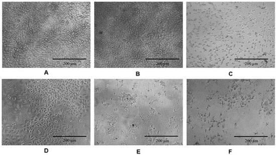 Morphological changes in 3T3 and HaCaT cells cultures exposed to different concentrations of T. nelsonii extract for 48 h. Images were taken using an inverted phase contrast microscope (NIKON TMS) at a X10× magnification. (A) 3T3 control cells; (B) 3T3 cells with 300 µg mL−1 without changes; (C) 3T3 cells with 1000 µg mL−1; cell detachment; (D) HaCaT cells with 100 µg mL−1; (E) HaCaT cells with 250 µg mL−1 cytoplasmic elongation; (F) HaCaT cells with 550 µg mL−1 formation of apoptotic bodies.
