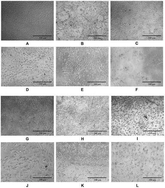 Likewise, A. americana extract and A. vera gel did not exhibit cytotoxicity at ranges of 1–40 µg mL−1 and 15–60% in 3T3 cells cultures, respectively, and 1–31 µg mL−1 and 15–50% in HaCaT cells cultures, respectively. Figure 2 displays the effect on the concentration of the extract and gel on the morphology of 3T3 and HaCaT cells after 48 h of exposure. Therefore, cell viability was directly proportional to the extract concentration. Additionally, the analysis of the morphology of 3T3 and HaCaT cells revealed the appearance of characteristics similar to apoptosis at concentrations higher than 50 µg mL−1 of the A. americana extract (Figure 2A–F) and at concentrations higher than 45% v/v in the case of the A. vera gel (Figure 2G–L).