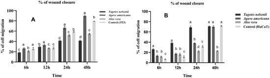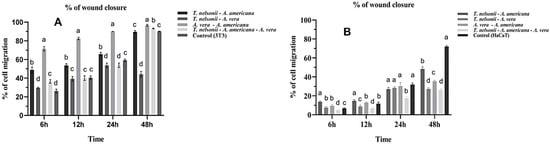 Effect of the extracts on wound closure expressed as percentage of cell migration. (A) on 3T3 cell culture with T. nelsonii extract (100 µg mL−1), A. americana extract (20.53 µg mL−1), A. vera gel (36.93% v/v), and control (untreated cells). (B) on HaCaT cell culture with T. nelsonii extract (74 µg mL−1), A. americana extract (15.5 µg mL−1), A. vera gel (26.69% v/v), and control (untreated cells). Different letters indicate statistically significant differences among the extracts with respect to each time according to the Tukey’s multiple range test (p < 0.05).