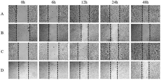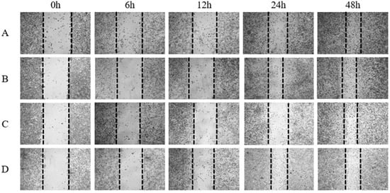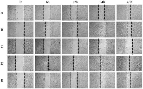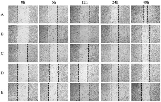 Cells without treatment were used as the negative control. Immediately after scratching, photographs were taken with a phase contrast microscope (ECLIPSE TS100, NIKON, Japan) using a 4 X objective to observe cell migration in the wound at 0, 6, 12, 24, and 48 h [64,65,66]. The open area of the wound was determined by analyzing the images using ImageJ software (version 1.50, Bethesda, MD, USA) [67,68]. The percentage of wound closure was calculated using Formula (2).